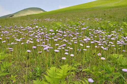 平成24年5月男鹿半島にある標高354mほどの低い山です。山頂付近は広大な芝生に覆われた山でドライブでも楽しめます、山頂には回転展望台があり日本海を一望できます。好天の日はパラグライダーがたくさん飛んでます。予想外に花の種類が多くてアズマギク…