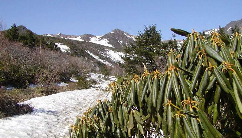 | 薬師岳までの下山は残雪ありぬかるみありで、いやなコースであった。登山道脇のシャクナゲが雪で倒れその上を人間が歩くのでシャクナゲは惨めでした。 |
